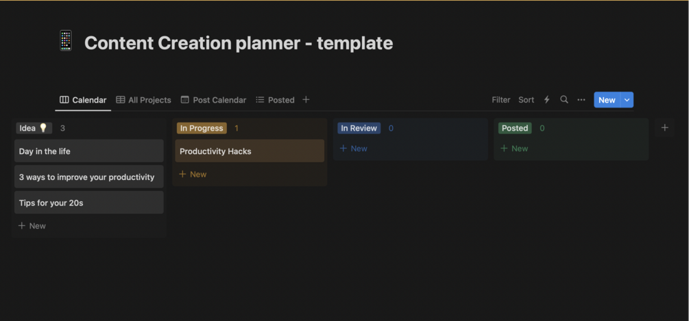 A simple second-brain style content creation template to store and plan your ideas for posting your next set of content.